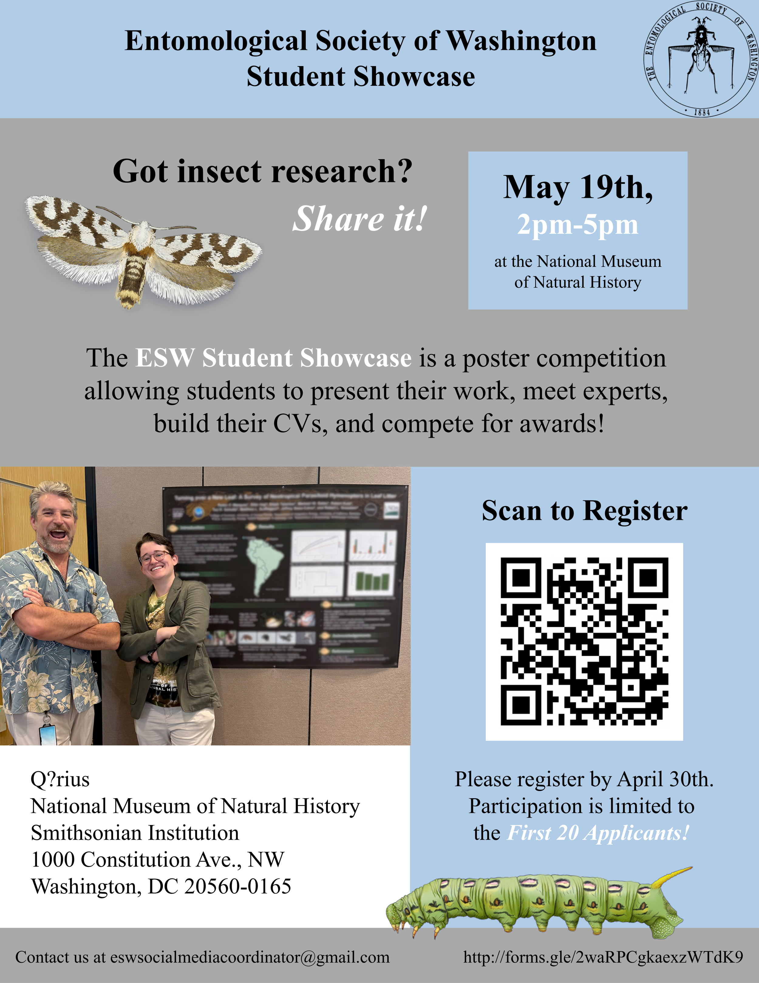 1st ESW Student Showcase Tuesday, May 19, 2026 2:00 PM 5:00 PM Entomological Society of Washington Q?rius, 10th St. & Constitution Avenue Northwest Washington, DC, 20560 United States (map) Google Calendar ICS ESW Student ShowcaseShare your insect research. This event is a poster competition allowing students to present their work, meet experts, build their CVs, and compete for awards. Registration form